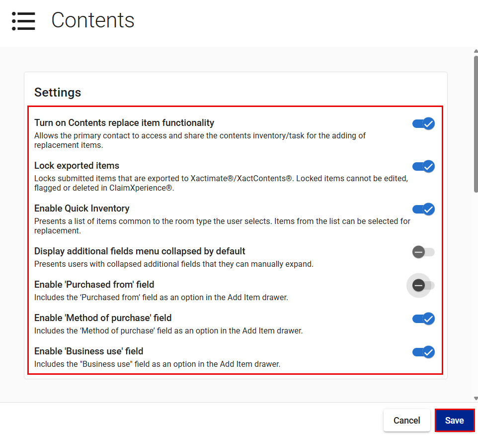 - Turn on Contents replacement item functionality, which allows primary contacts to add replacement items, access and share inventories, and assign inventory-related tasks.