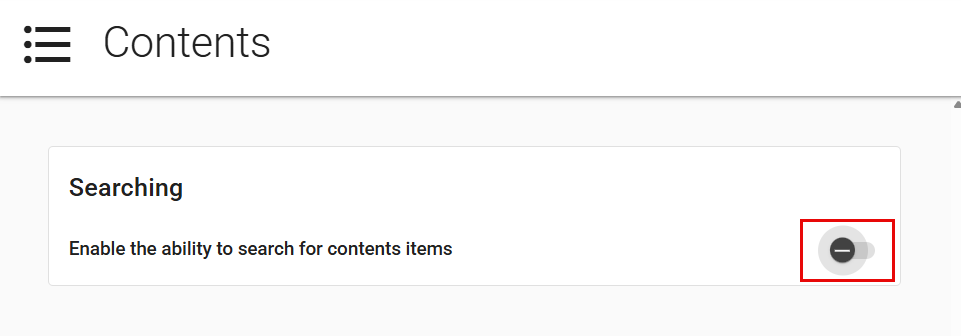 - In the Searching card, switch on the Enable the ability to search for contents items toggle. This allows users to search for items in the Contents workflow.