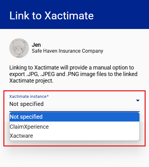 - Open the Xactimate instance list by clicking or tapping the Xactimate instance line. The list only contains the instances you have access to.