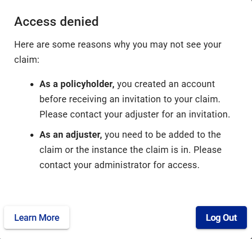 Adjusters who try to access claims or instances they haven’t been added to are denied access. Adjusters who see this error message should contact their administrators to resolve the error.
