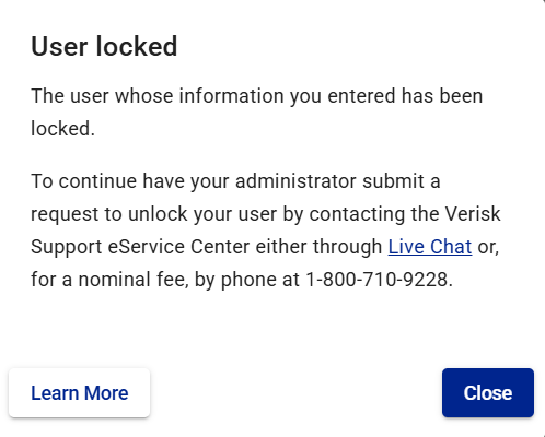 If a user sees the User locked error dialog when they attempt to log in, they have been locked at an administrative level. There are various reasons this can occur. Locked users in this situation cannot unlock themselves and should contact their administrators who will work with the Verisk Support team to resolve this issue.