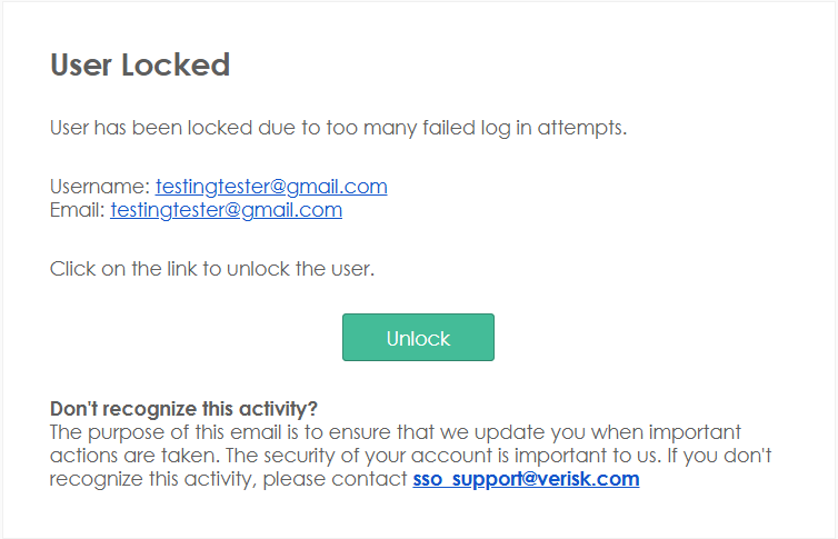 Users who make too many unsuccessful attempts to access their account will receive a User locked error email letting them know they have been locked. The email includes a way for them to unlock themselves.
