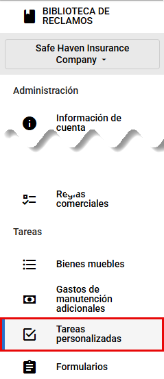 - En la vista de administrador de la instancia de ClaimXperience, seleccione Tareas personalizadas en el menú de navegación lateral.