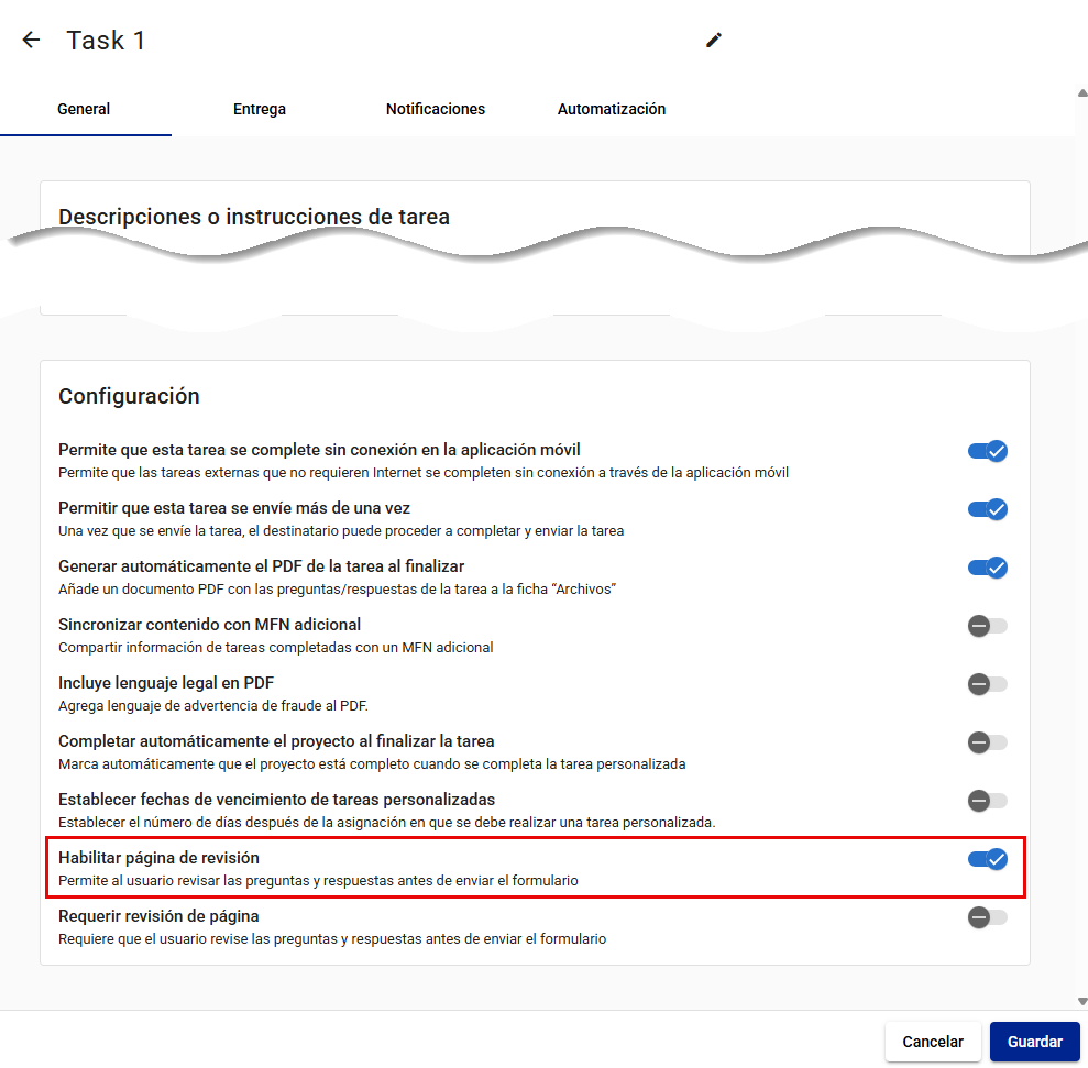 - En la tarjeta Configuración de la pestaña General, active la opción Habilitar página de revisión.