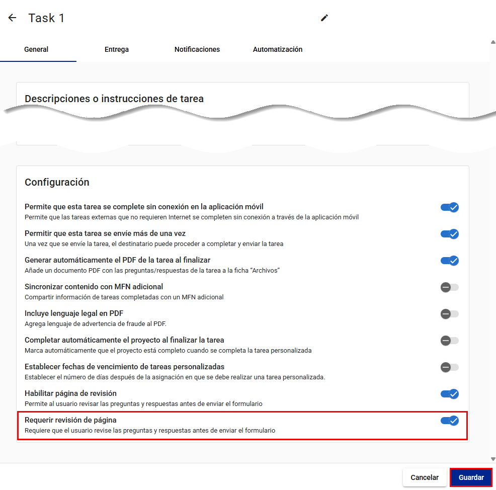 - Seleccione la tarea que desea que los usuarios revisen antes de enviar. Se abre la configuración del formulario.