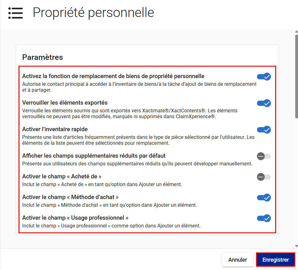 - Activer la fonctionnalité d’article de remplacement de propriété personnelle, qui permet aux contacts principaux d’ajouter des articles de remplacement, d’accéder aux inventaires et de les partager, et d’attribuer des tâches liées à l’inventaire.