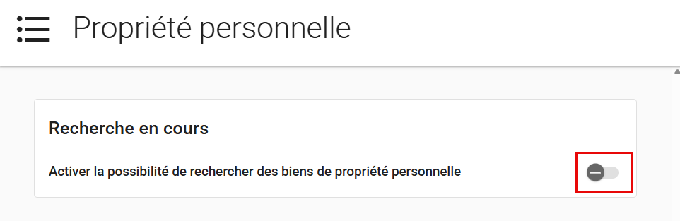 - Dans la carte de recherche, activez le commutateur Activer la possibilité de rechercher des articles de propriété personnelle. Cela permet aux utilisateurs de rechercher des articles dans le flux de travail Propriété personnelle.