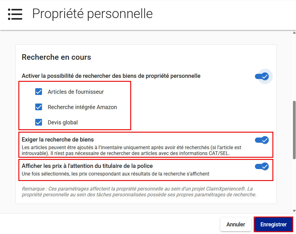 - Pour demander aux utilisateurs de rechercher des articles dans ClaimXperience, activez le commutateur Exiger la recherche de biens.