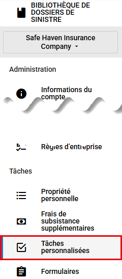 - Dans la vue administrateur de l’instance de ClaimXperience, sélectionnez Tâches personnalisées dans votre menu de navigation latéral.