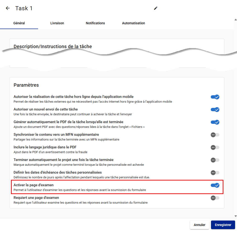 - Dans la carte Paramètres sous l’onglet Général, activez le bouton Activer la page d’examen.