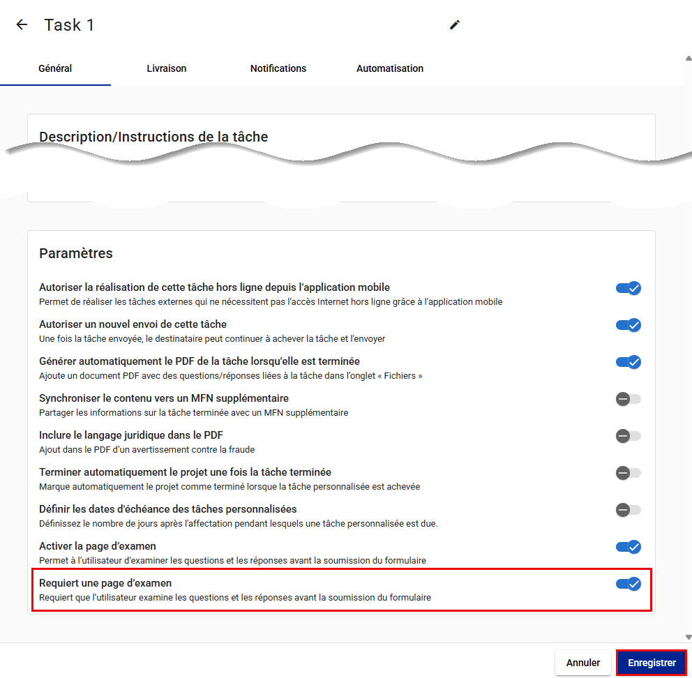 Vous pouvez autoriser, voire exiger, que vos utilisateurs vérifient les réponses qu’ils saisissent dans un formulaire de tâche personnalisé.