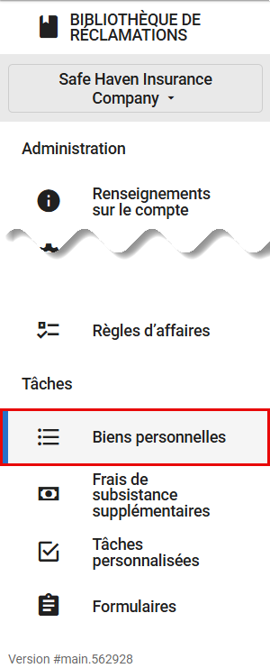 - Dans la vue Administration de ClaimXperience, sélectionnez Biens personnels dans votre menu de navigation latéral.