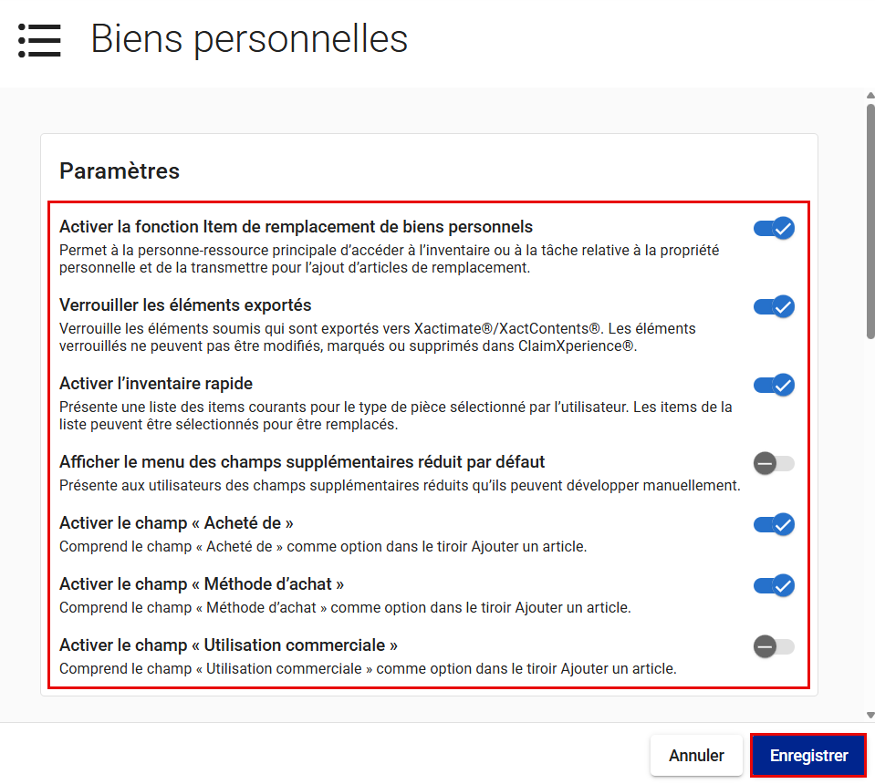 - Activer la fonction Item de remplacement de biens personnels, qui permet aux contacts principaux d’ajouter des articles de remplacement, d’accéder aux inventaires et de les partager, ainsi que d’attribuer des tâches liées à l’inventaire.