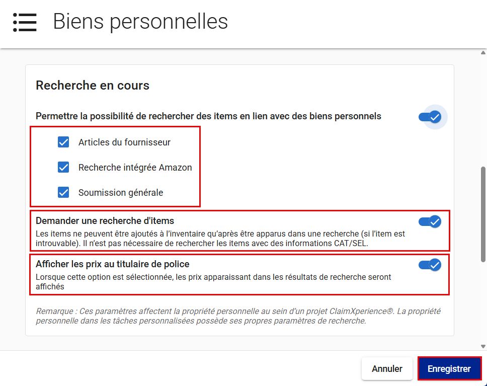 - Pour obliger les utilisateurs à rechercher des articles dans ClaimXperience, activez le bouton Demander une recherche d’items.