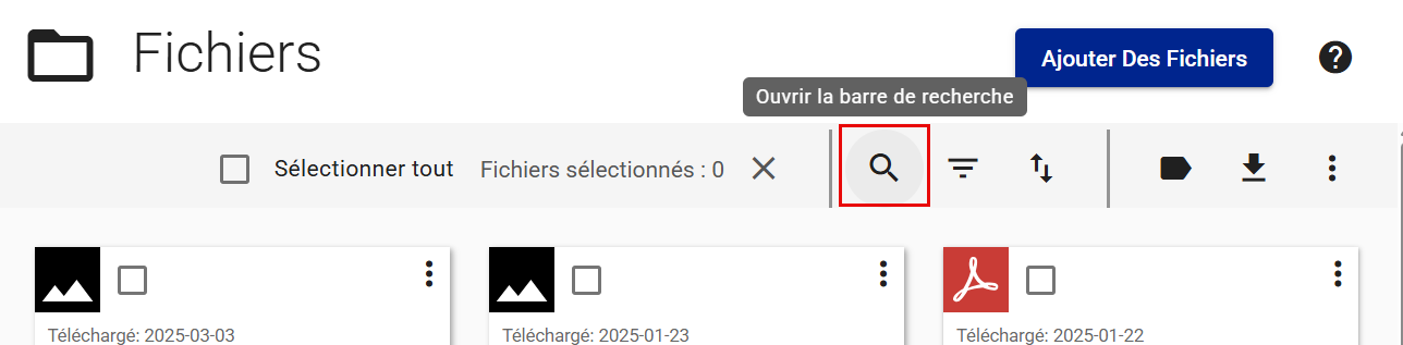 - Sélectionnez l’icône Ouvrir la barre de recherche pour afficher le champ Rechercher des fichiers.